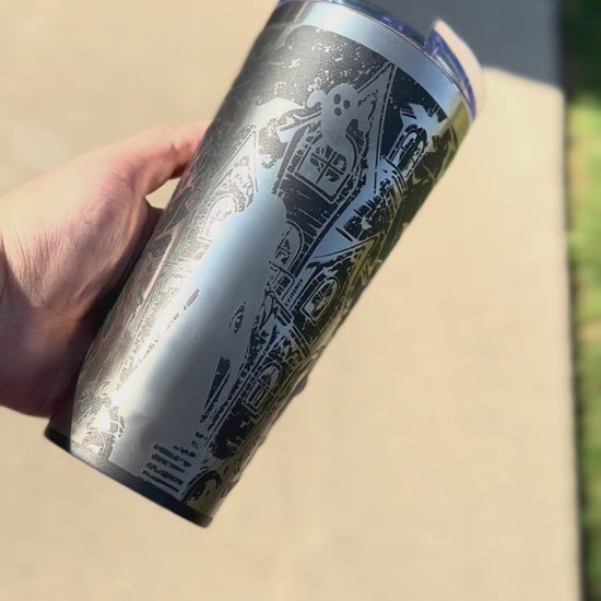 Embrace the eerie allure of the season with our Fright Night tumbler. This 20oz black stainless steel cup features a hauntingly detailed full-wrap engraving β weaving together shadows, webs, and ghostly silhouettes for a design that feels like a scene straight out of Halloween night.